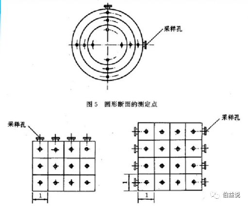 ③对圆形烟道,采样孔应设在包括各测点在内的相互垂直的直径线上(如下图所示)。对矩形或方形烟道,采样孔应设在包括各测点在内的延长线上(如下图所示)。