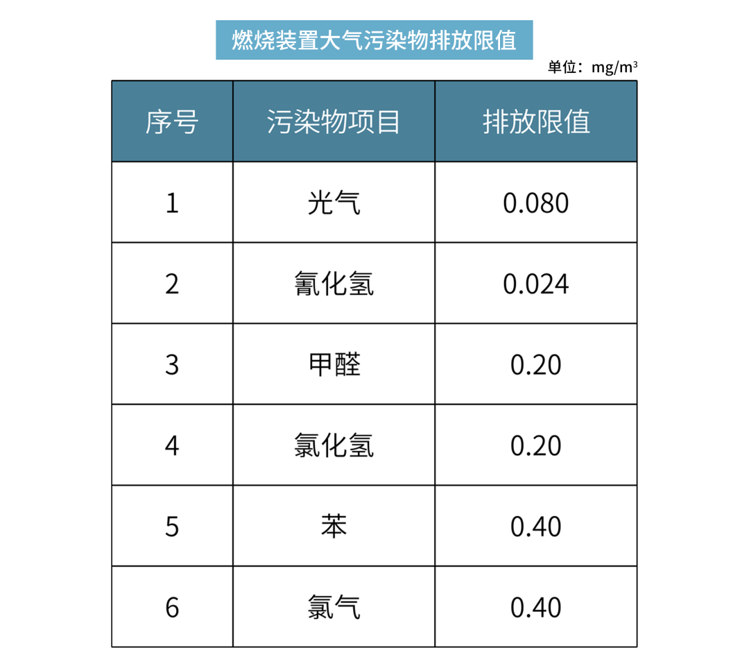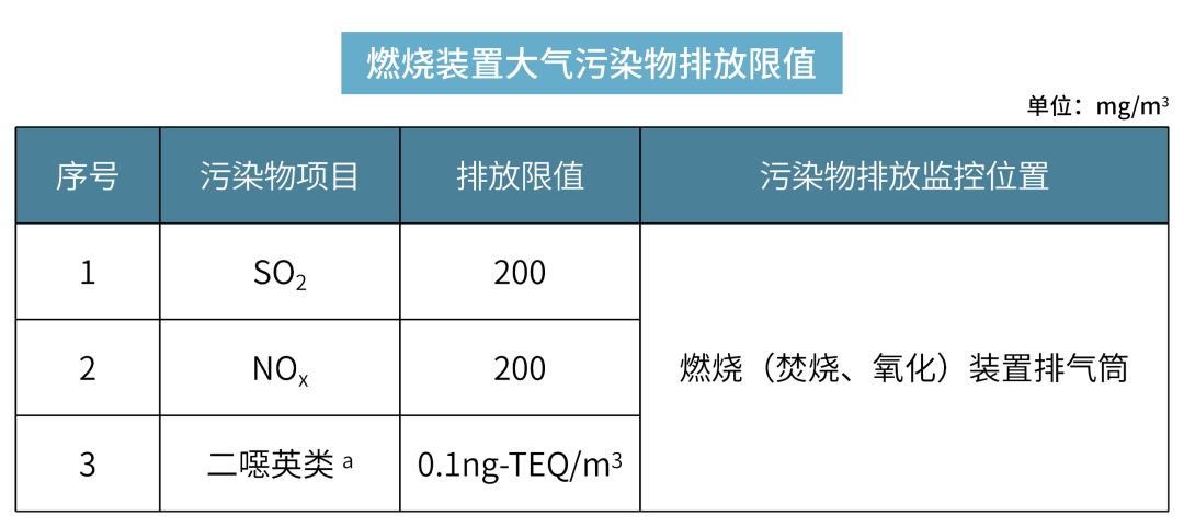 VOCs 燃烧(焚烧、氧化)装置除满足上表的大气污染物排放要求外,还需对排放烟气中的二氧化硫、氮氧化物和二噁英类进行控制,达到下表规定的限值。利用锅炉、工业炉窑、固废焚烧炉焚烧处理有机废气的,还应满足相应排放标准的控制要求。